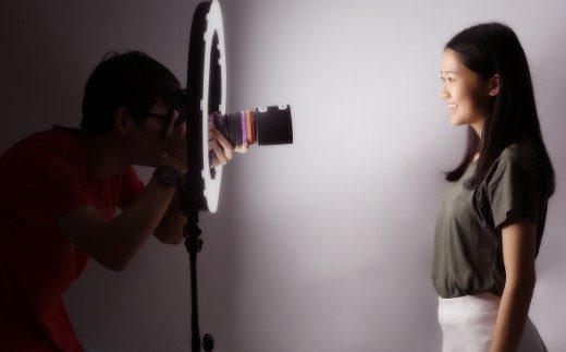 Ring lights can be easily utilised to create colour effects simply by switching the normal white bulbs with different colored lights or by applying coloured gels on several areas of the ring light.